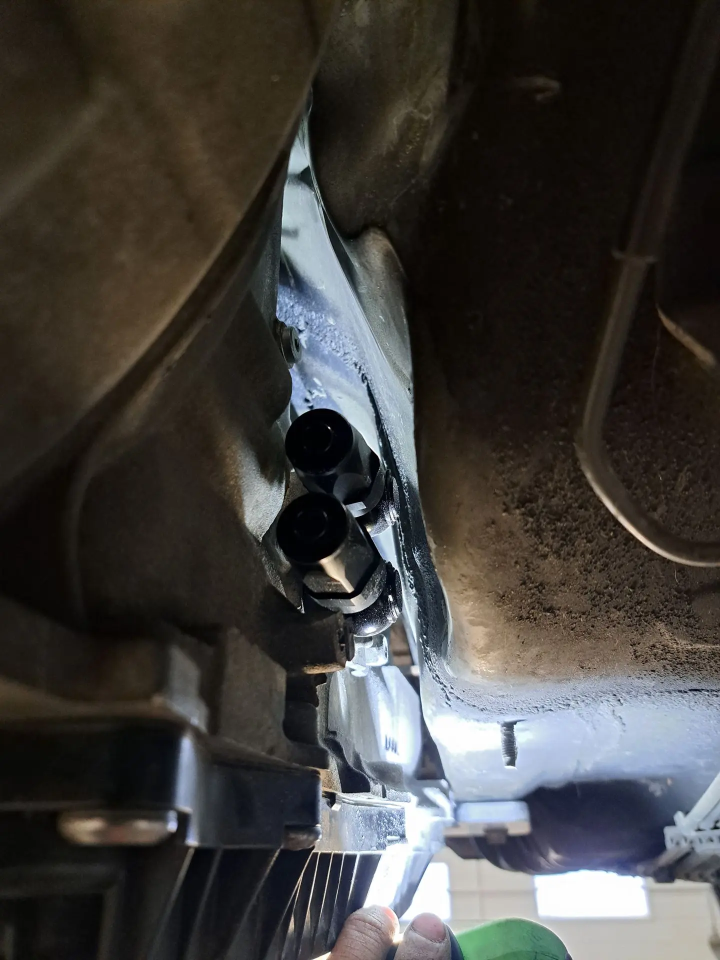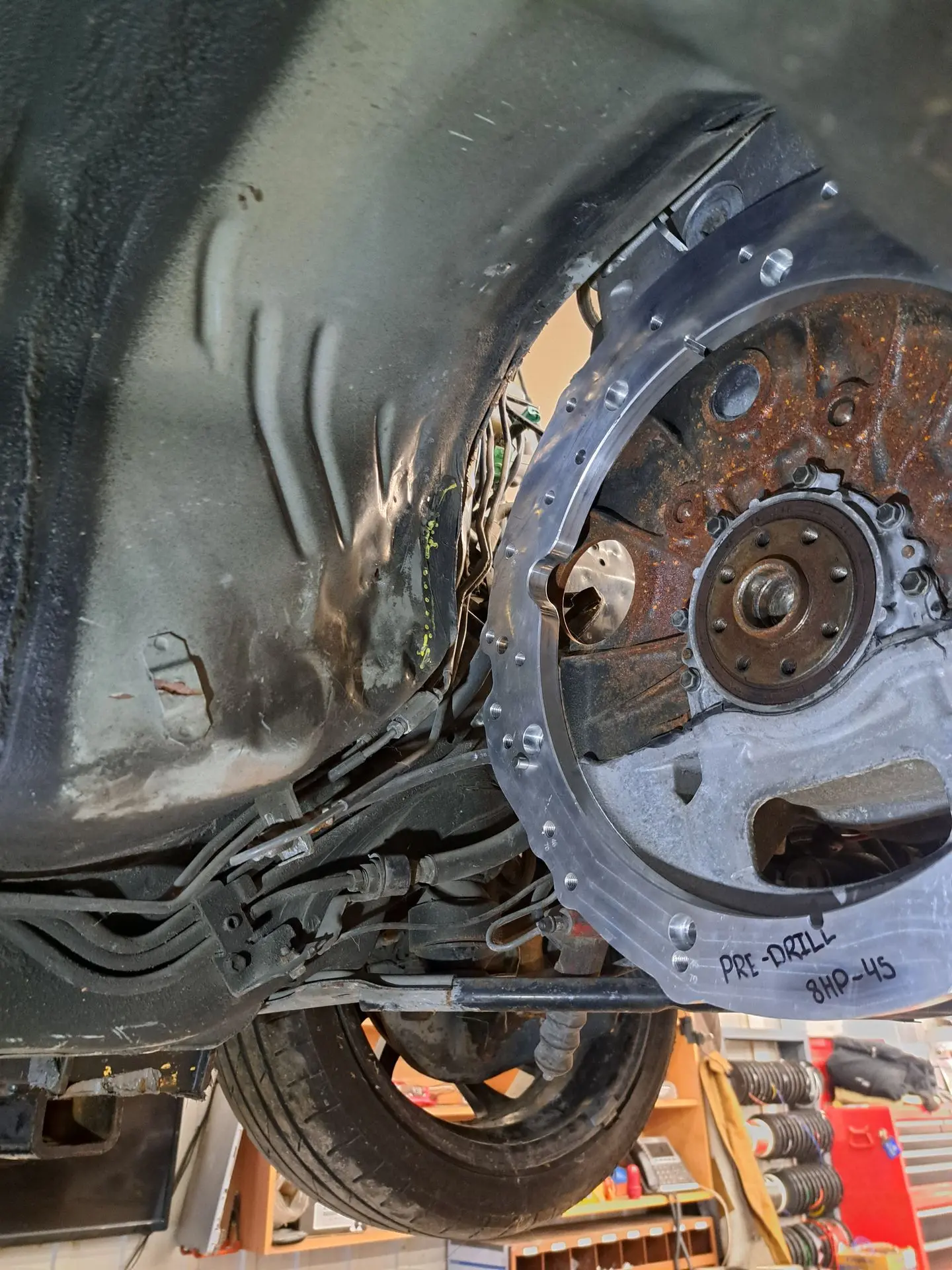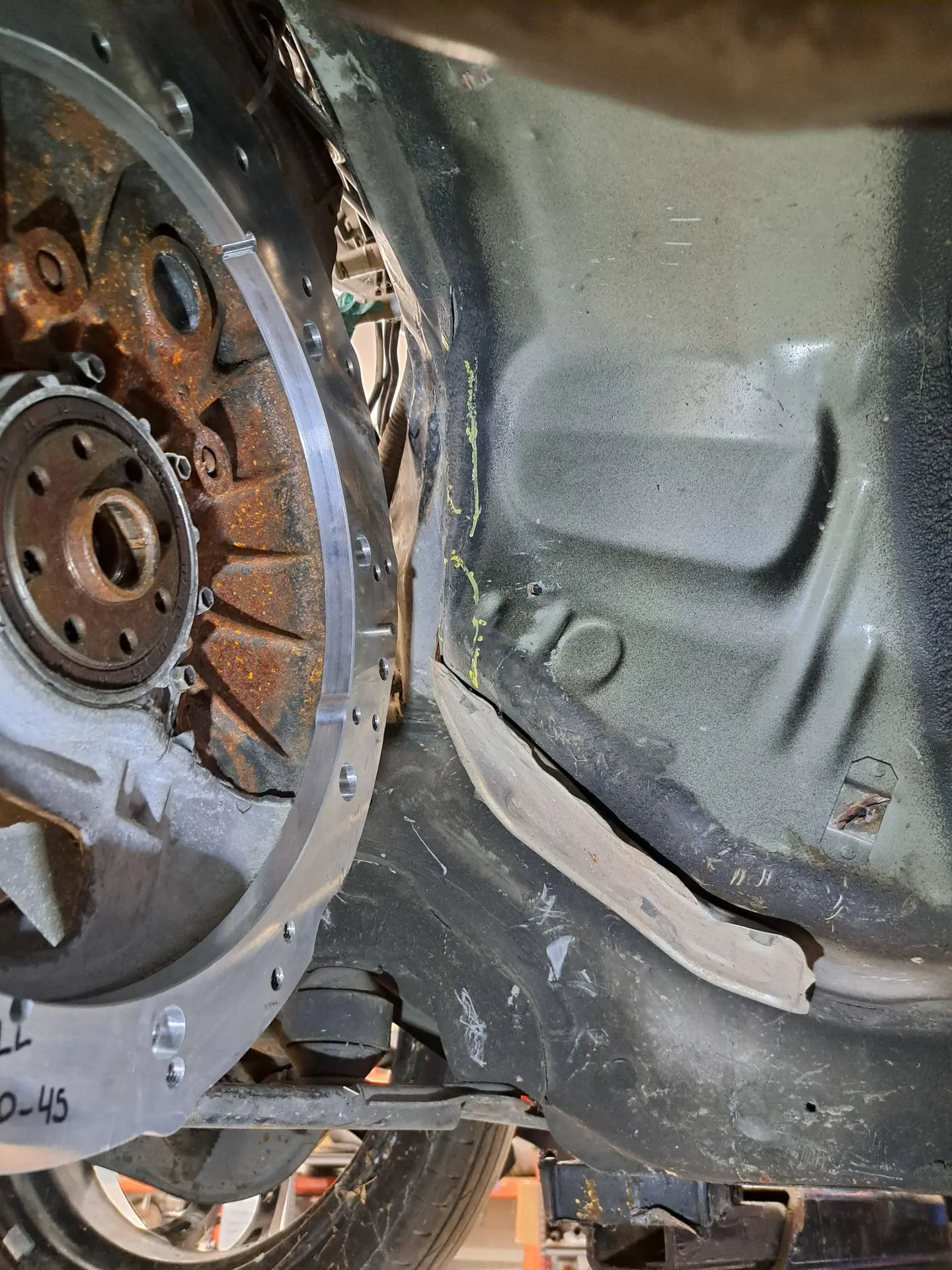 The tight area is near the firewall. The bellhousing on both the 8HP70 and 8HP45 is large but tapers quickly. To simplify the installation and increase clearance, we moved the engine forward by 5/8 inch using our custom stainless motor mounts. With this setup, the fitment becomes straightforward and much cleaner.